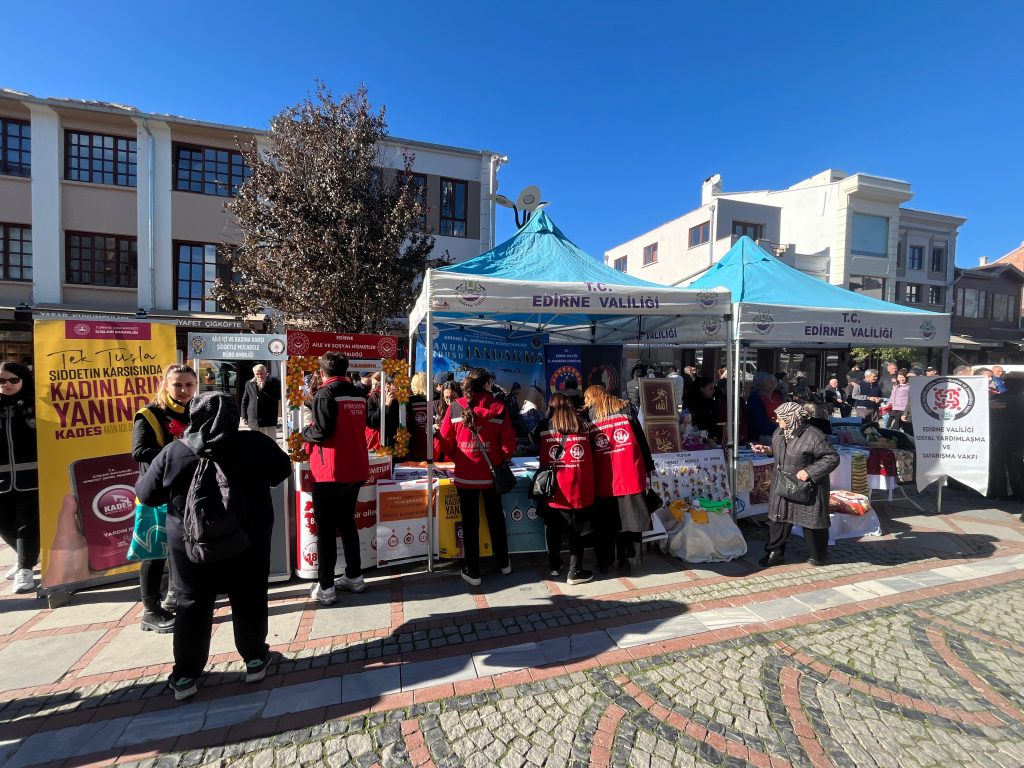 Edirne'de 25 Kasım Kadına Karşı Şiddetle Mücadele Günü kapsamında, Aile ve Sosyal Hizmetler İl Müdürlüğü öncülüğünde Saraçlar Caddesi’nde stant açıldı. Etkinlikte, Edirne Sosyal Dayanışma Merkezi (SODAM) ürünlerinin satışı yapılırken, kadınlara yönelik şiddet konusunda bilgilendirmeler de gerçekleştirildi. Edirne Valisi Yunus Sezer de standı ziyaret ederek, "Kadına karşı şiddetin önlenmesine dair olmak üzere başta Aile ve Sosyal Hizmetler Bakanlığımız, tüm birimlerimiz, kolluk birimlerimiz, sivil toplum kuruluşlarımız ortak bir çaba içerisindeler" dedi.