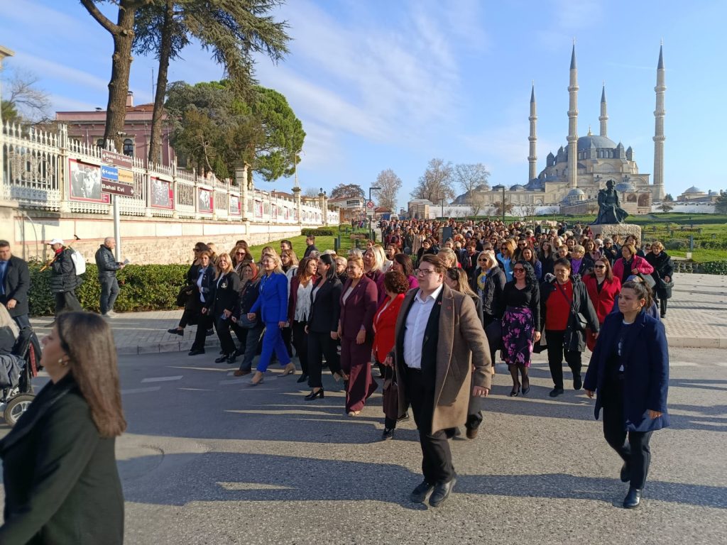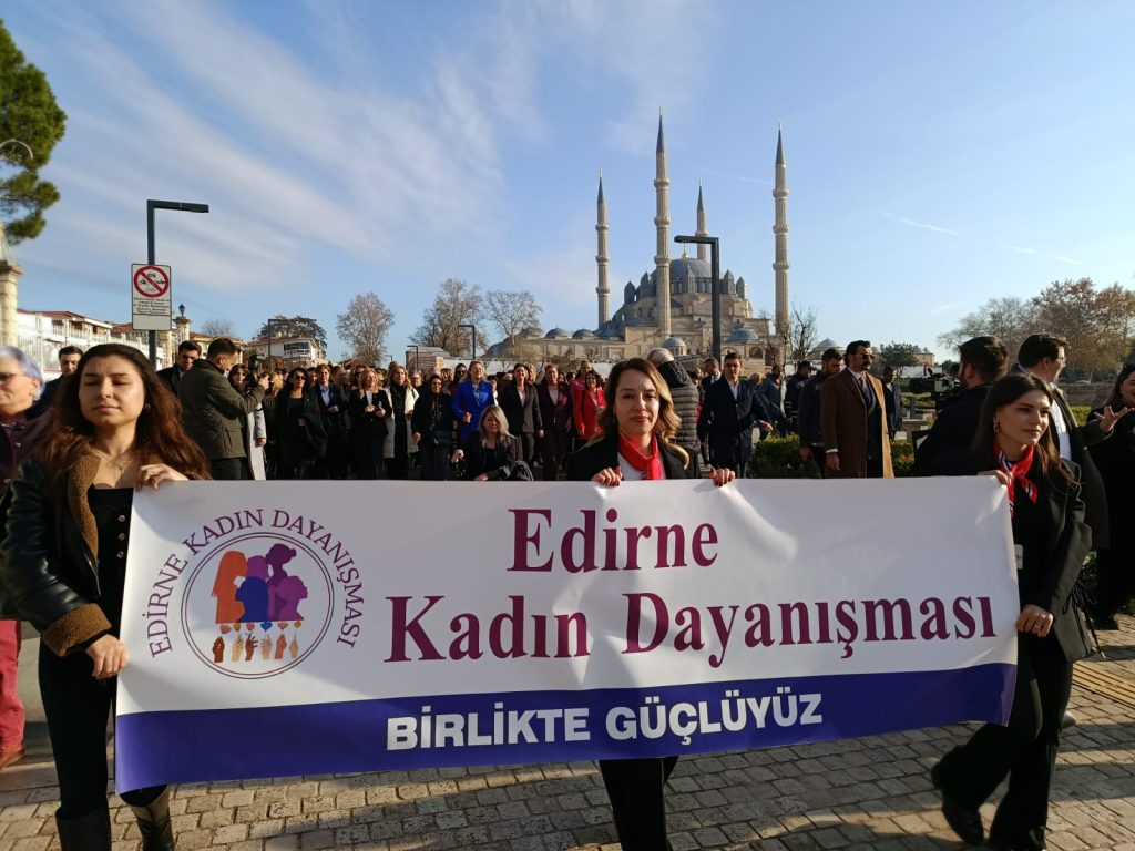 Heyete, Edirne’deki sivil toplum kuruluşlarının oluşturduğu Edirne Kadın Dayanışması temsilcileri de katılırken, oluşturulan kortej belediye önünden Atatürk Anıtı’na yürüyerek çelenk sundu.