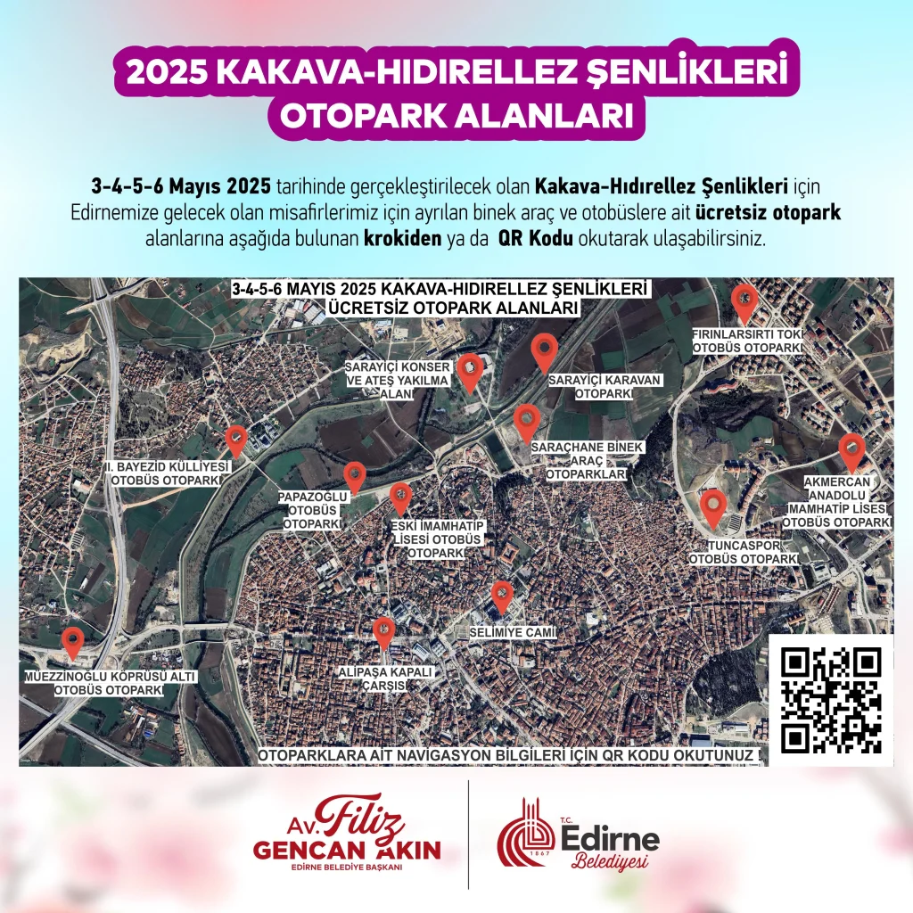 3-4-5 ve 6 Mayıs tarihinde gerçekleştirilecek olan Kakava-Hıdırellez Şenlikleri için Edirne'ye gelecek olan misafirler için binek araç ve otobüslere ait ücretsiz otopark alanları;