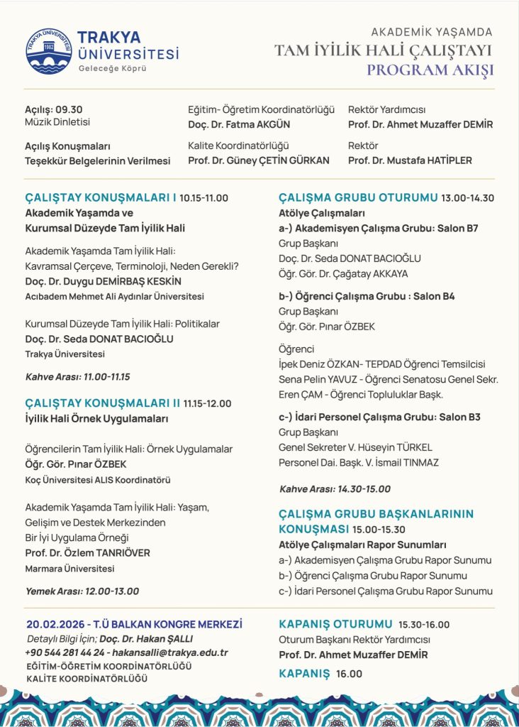 Trakya Üniversitesi’nde 20 Şubat'ta düzenlenecek olan “Akademik Yaşamda Tam İyilik Hali Çalıştayı”, akademisyen, öğrenci ve idari personeli bir araya getirerek üniversite yaşamında güçlü bağlar ve kapsayıcı bir kampüs kültürü oluşturmayı hedefliyor.