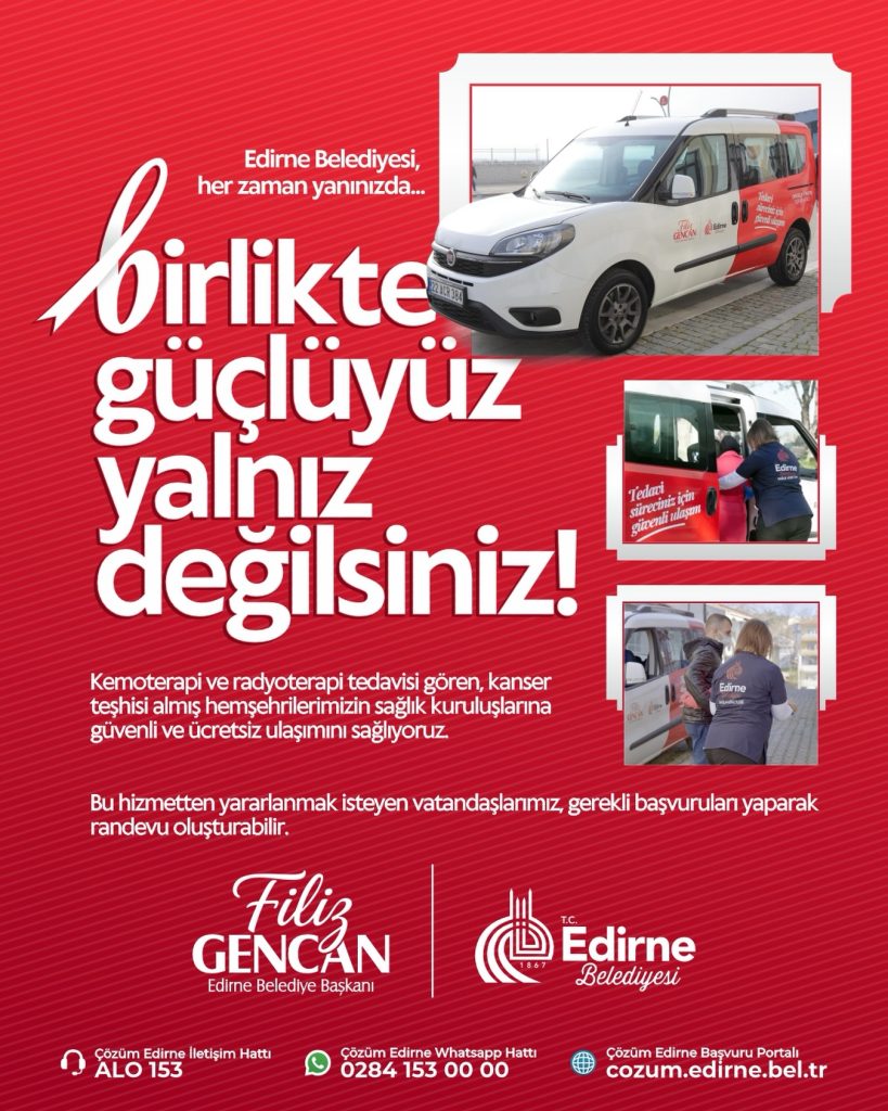 “Birlikteyiz, yanınızdayız” mesajıyla kamuoyuna duyurulan hizmet kapsamında, kanser teşhisi almış Edirneli vatandaşların sağlık kuruluşlarına güvenli ve ücretsiz şekilde ulaşımları sağlanıyor. Edirne Belediyesi, özellikle uzun ve yorucu tedavi süreçlerinde hastaların yalnız olmadığını hissettirmeyi ve sosyal belediyecilik anlayışıyla her aşamada yanlarında olmayı hedefliyor.