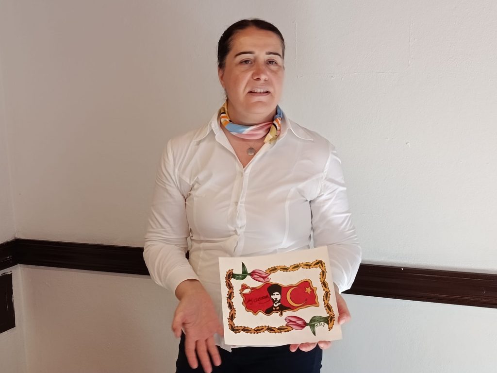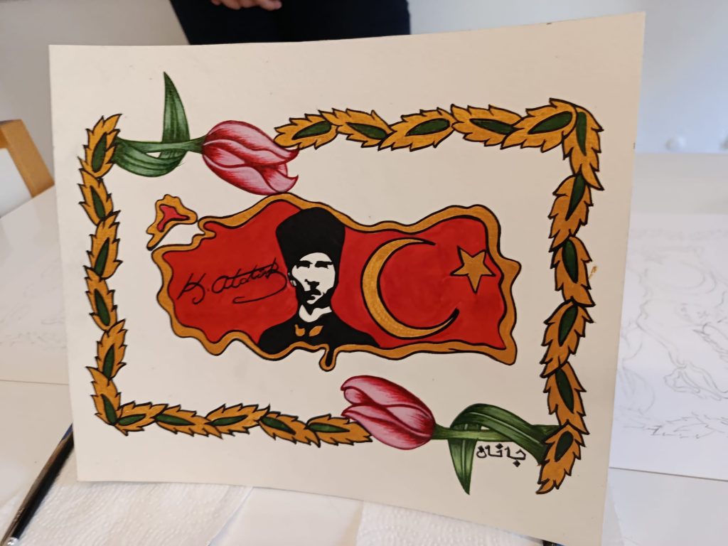 Gürcenan, 30 Ağustos’a özel düzenledikleri atölye çalışmasıyla ilgili de bilgi vererek; “Bugün için hazırladığım eser, Türkiye haritası kompozisyonu üzerine inşa edilmiştir. Çerçevesini oluşturduktan sonra içini Edirne kırmızısı ile ki bu aynı zamanda bayrağımızın rengidir; tamamladım. Haritanın merkezine ay-yıldızı yerleştirdim ve Gazi Mustafa Kemal Atatürk’ün imzasıyla eseri taçlandırdım. Çerçeve kısmında stilize edilmiş yaprak desenleri kullandım, ayrıca Edirne’nin simgesi olan lalelere yer verdim. Böylece hem geleneksel üslubu yaşatmaya hem de günün anlamını yansıtmaya çalıştım” şeklinde konuştu.
