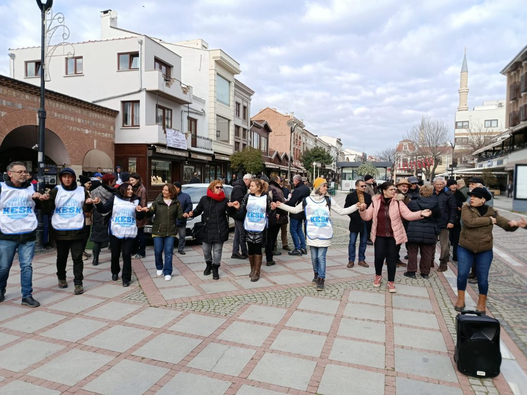 Edirne Saraçlar Caddesi’nde bir araya gelen KESK’e bağlı sendikaların temsilcileri ile çok sayıda sivil toplum kuruluşu temsilcisi, pankartlar açarak sloganlar attı. Eylemde, kamu emekçilerinin her geçen gün derinleşen geçim sıkıntısına ve alım gücündeki erimeye dikkat çekildi.