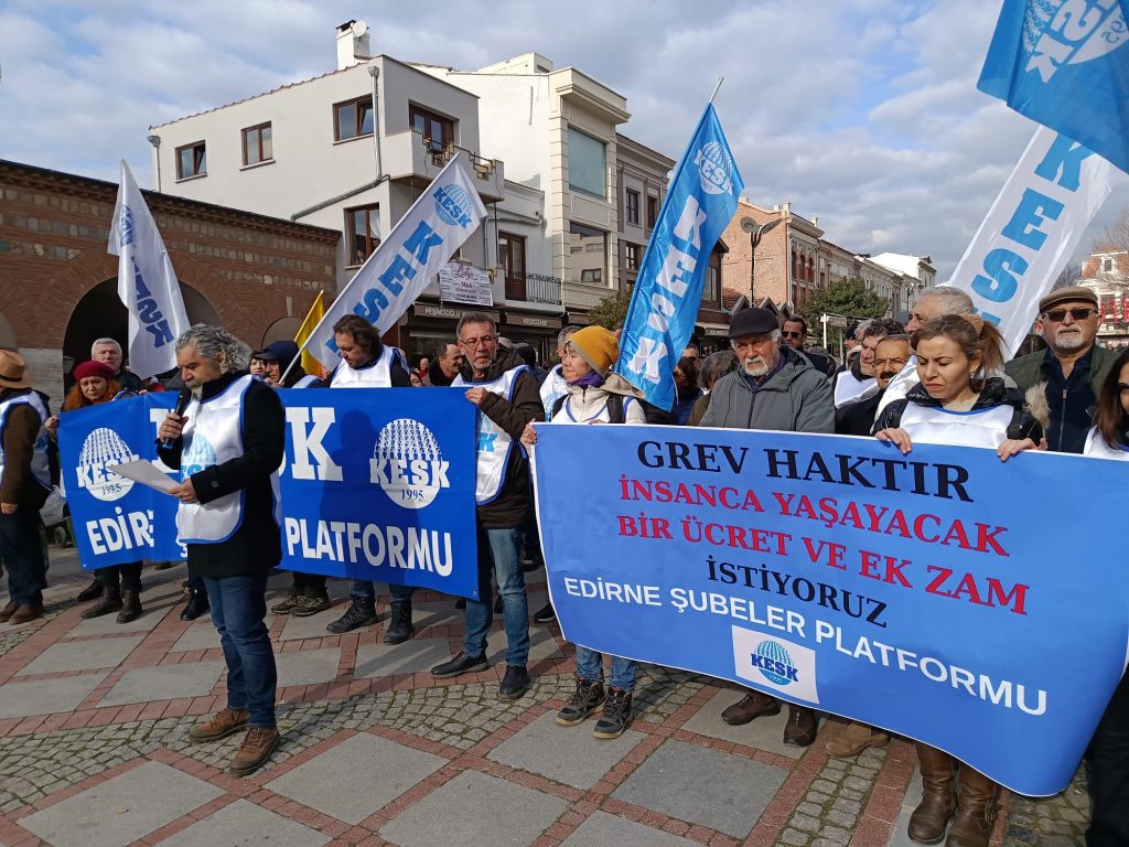 Kamu Emekçileri Sendikaları Konfederasyonu (KESK) Edirne Şubeler Platformu, insanca yaşam ve ek zam talebiyle iş bıraktı. Platform tarafından Saraçlar Caddesi'nde gerçekleştirilen basın açıklamasında konuşan, Platform Sözcüsü Ahmet Acet yüksek enflasyon, eriyen maaşlar ve adaletsiz vergi yüküne karşı grevli toplu pazarlık hakkı çağrısı yaparak, "Hepimizin hak ettiği insanca yaşam koşulları için bugün en temel hakkımızı, üretimden gelen gücümüzü kullanıyor, iş bırakıyoruz. Emeğimizin karşılığı için ülkenin dört bir yanında grevdeyiz" dedi.
