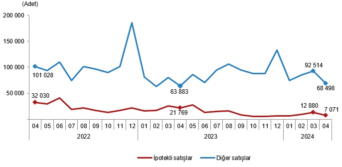 Türkiye genelinde ipotekli konut satışları Nisan ayında bir önceki yılın aynı ayına göre %67,5 azalış göstererek 7 bin 71 oldu. Toplam konut satışları içinde ipotekli satışların payı %9,4 olarak gerçekleşti. Ocak-Nisan döneminde gerçekleşen ipotekli konut satışları ise bir önceki yılın aynı dönemine göre %57,0 azalışla 34 bin 693 oldu.