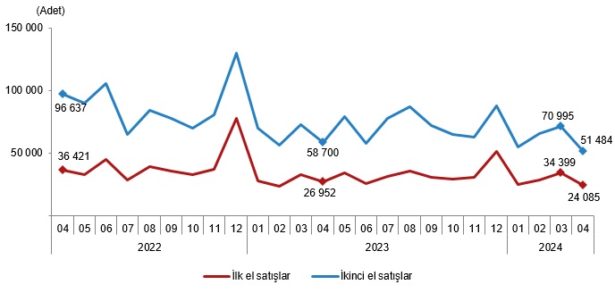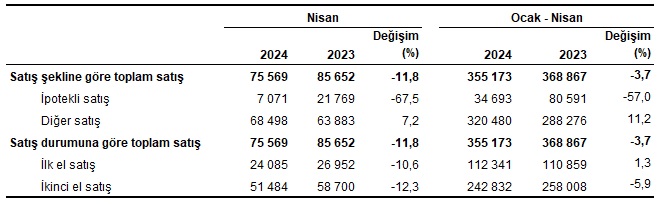 Türkiye genelinde ikinci el konut satışları Nisan ayında bir önceki yılın aynı ayına göre %12,3 azalış göstererek 51 bin 484 oldu. Toplam konut satışları içinde ikinci el konut satışının payı %68,1 oldu. İkinci el konut satışları Ocak-Nisan döneminde ise bir önceki yılın aynı dönemine göre %5,9 azalışla 242 bin 832 olarak gerçekleşti.