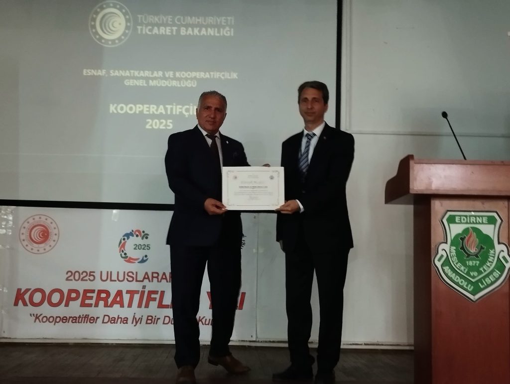 Açılış konuşmasında kooperatifçiliğin önemine değinen Edirne Ticaret İl Müdür Vekili Mustafa Kurt; “Kooperatif işletmeler sahip olduğu ilke ve değerler gereği iklim değişikliği, yoksullukla mücadele, gıda güvenliği ve sürdürülebilir kalkınma gibi pek çok küresel konuda aktif rol oynamaktadır. Bu sebeple sürdürülebilir kalkınma hedefleri doğrultusunda Birleşmiş Milletler 2025 Yılını Uluslararası Kooperatifler Yılı ilan etmiştir. 2025 Uluslararası Kooperatifler Yılı kutlamaları ve etkinlikleri tüm dünyada kooperatif işletmelere dikkat çekmeyi ve kooperatifler eliyle topyekûn bir ekonomik ve sosyal kalkınmayı hedeflemektedir. Bu amaçla Ticaret Bakanlığımızca 2025 Uluslararası Kooperatifler Yılı kapsamında yürütülecek faaliyetlerin etkin bir şekilde düzenlenmesi için 81 Ticaret İl Müdürlüğüne talimat gönderilmiştir. 2025 yılının Uluslararası Kooperatifler Yılı olarak ilan edilmesi ülkemizde de yüz yıllık bir maziye sahip olan kooperatifçilik kültürünün gelecek nesillere aktarılması, karşılıklı yardım, dayanışma ve demokrasi temelli kooperatif yapılanmalarına ilişkin farkındalığın artırılması için kaçırılmayacak bir fırsattır. Bu sebeple, Uluslararası Kooperatifler Yılı hakkında yapılacak çalışma, etkinlik ve organizasyonlarla 2025 yılının en iyi şekilde değerlendirilmesi planlanmaktadır” dedi. Konuşmaların ardından Edirne Mesleki ve Teknik Anadolu Lisesi Müdürü Sedat Çelikkalp’e okulu adına, eğitimlere katılım belgesi takdim edildi.