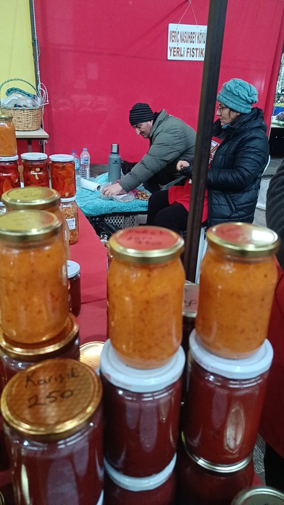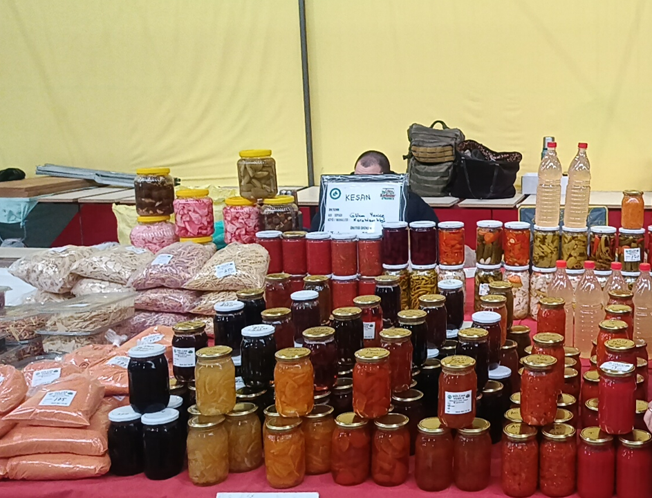 Keşan’ın Karahisar köyünde kendi bahçesinde yetiştirdiği ürünlerle hazırladığı reçel, tarhana, turşu ve ev makarnalarını Edirnelilerle buluşturan iki çocuk annesi Gülcan Yenice’nin tezgâhında yok yok.