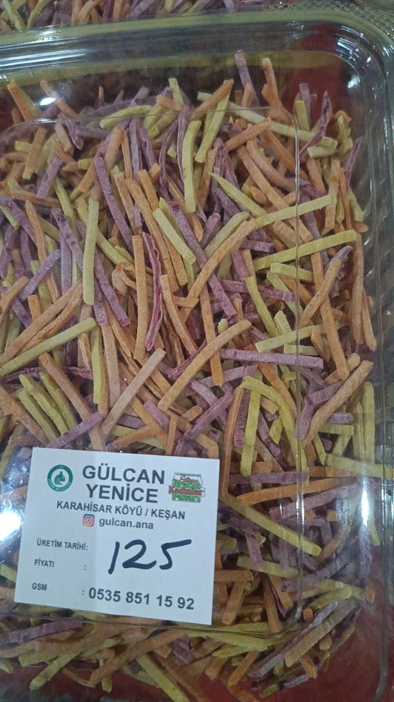 Doğal köy yumurtası ve sütü kullanılarak yapılan ev makarnaları (erişteler) de tezgâhın en çok ilgi gören ürünleri arasında bulunuyor. Bunun yanı sıra domates ve biber salçaları, kış aylarının vazgeçilmezleri arasında yer alan tarhana ve turşular da satışa sunuluyor.