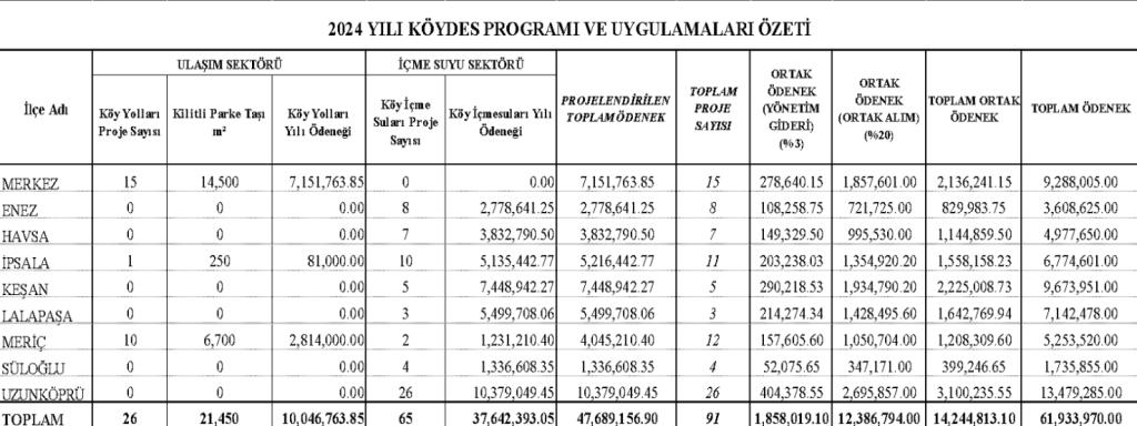 Edirne Valiliği, 2024 KÖYDES programıyla Edirne’de 61 milyon 933 bin 970 lira ödenekle, 26'sı ulaşım, 65'i içme suyu olmak üzere toplam 91 projenin hayata geçirileceğini duyurdu.