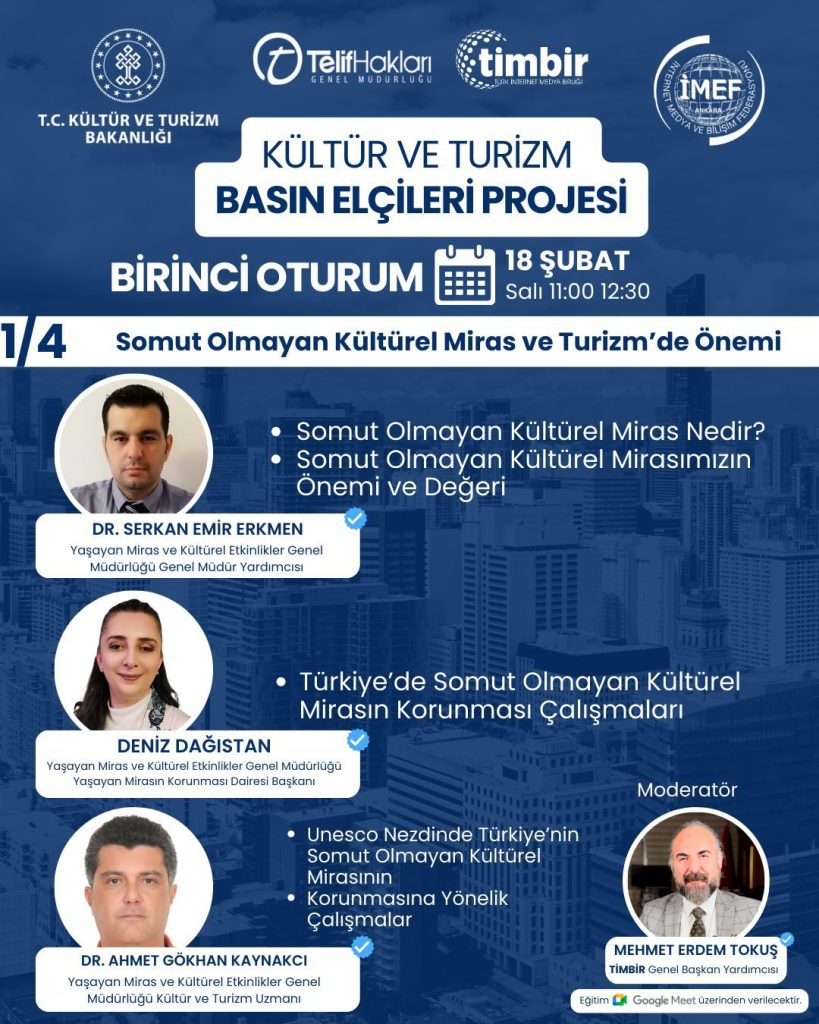 Kültür ve Turizm Bakanlığı, Telif Hakları Genel Müdürlüğü tarafından desteklenen, İnternet Medya ve Bilişim Federasyonu tarafından yürütülen medya mensuplarının kültür ve turizm haberciliğine daha duyarlı ve daha bilinçli haber yapılabilmesini teminen düzenlenen “Kültür ve Turizm Basın Elçileri” projesi TİMBİR işbirliği ile başlıyor.
