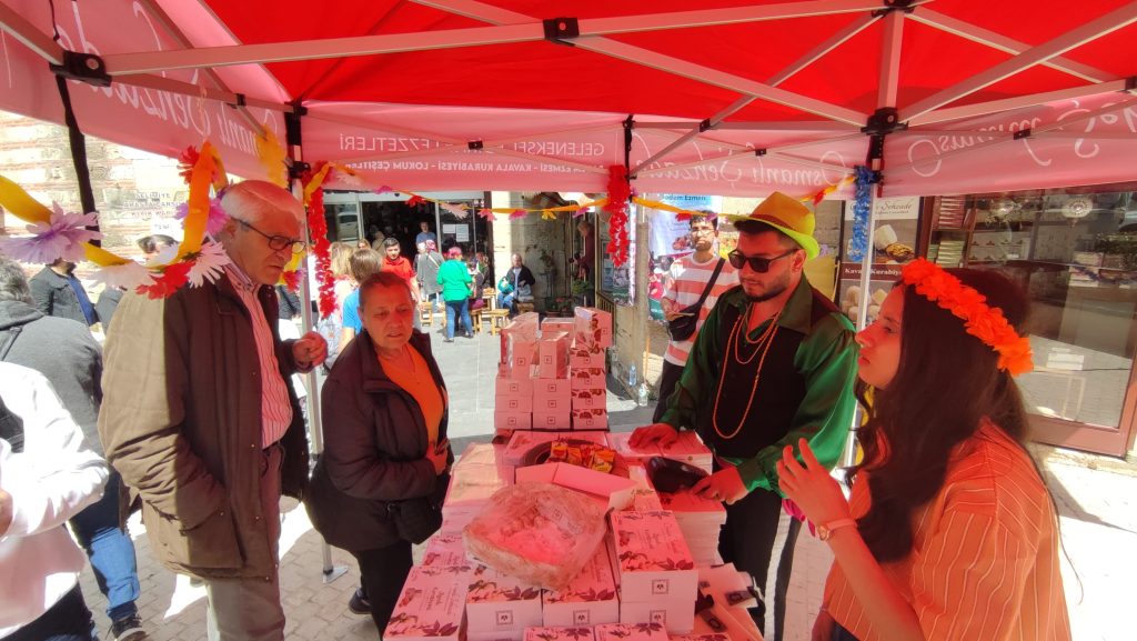 Kakava ve Hıdrellez şenliklerinde ziyaretçi akınına uğrayan Edirne’de Osmanlı Şehzade kurabiye ve badem ezmesi firmasının satış noktalarında çalışan personeller, Kakava’ya özgü rengarenk kıyafetlerini giyerek ziyaretçilerini ağırlıyorlar.