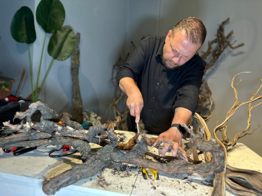 Mehmet Doğruöz, bankacılıktan ayrıldıktan sonra önce eşinin dükkânında çalışmaya başladı, ardından kendi atölyesini kurarak üretime başladı. Yaptığı işin doğayla iç içe olduğunu anlatan Doğruöz, “Bankacılık sektöründe yaklaşık 20 yıl hizmet verdikten sonra artık sıkılmaya başladım. Ticari kaygılarımız da vardı. Eşim zaten ticaretle uğraşıyordu, onun yanında ağaç yapım işini öğrenmeye başladım. Doğadan ilham aldım. Ardından geri dönüşüm malzemelerini kullanmaya başladım. Herhangi bir ağacı kesmiyoruz. Yolda yürürken gördüğümüz çürümüş ya da devrilmiş ağaçların köklerini çıkarıyoruz. Onları tek tek temizliyoruz, vernikliyoruz ve son haline getirip satışa sunuyoruz” dedi.
