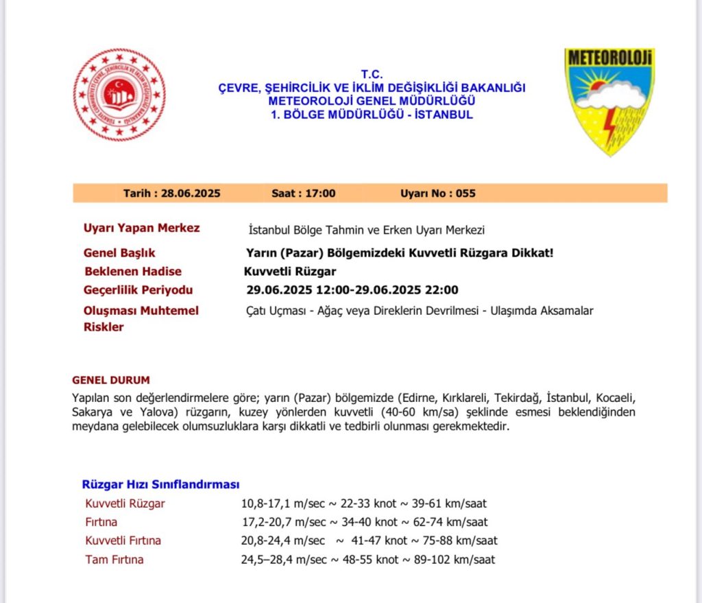 Yapılan uyarıda; “Bölgemizde yarın (29.06.2025) öğlen saatlerinden itibaren fırtına beklendiğinden, Çatı Uçması - Ağaç veya Direklerin Devrilmesi - Baca Gazı Zehirlenmesi - Ulaşımda Aksamalar gibi olumsuzluklara karşı dikkatli ve tedbirli olunması gerekmektedir” ifadelerine yer verildi. Haber Merkezi