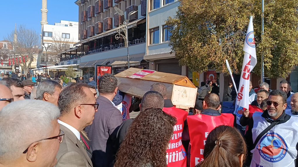 TBMM’de görüşmeleri süren 2026 bütçesinde emekçi ve emeklilere yeterli pay ayrılmadığını savunan Birleşik Kamu-İş’e bağlı sendikalar, Edirne’de bir günlük iş bıraktı. Saraçlar Caddesi’nde düzenlenen açıklamada, memur ve emeklinin yaşadığı ekonomik zorluğa dikkat çekilerek, üzerinde “Devletin Memuru” ve “Emekliler” yazılı temsili tabutla protesto edildi.