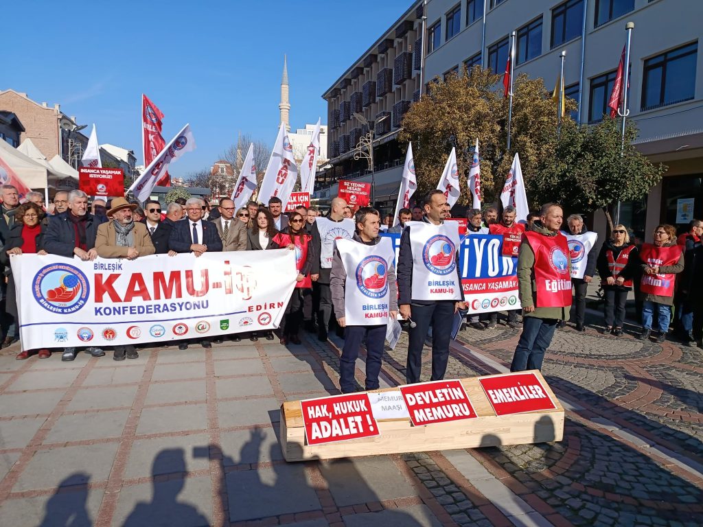Birleşik Kamu-İş Konfederasyonu’na bağlı sendikalar, emekçiyi yoksullaştıran ve sermayeyi önceleyen ekonomi politikalarına karşı; insanca yaşam koşulları, adil ücret ve eşit paylaşım talepleriyle Türkiye genelinde iş bıraktı. Edirne’de de konfederasyona bağlı sendikaların katılımıyla Saraçlar Caddesi’nde basın açıklaması düzenlendi. Açıklamaya siyasi parti temsilcileri ile çeşitli sivil toplum kuruluşları da destek verdi.