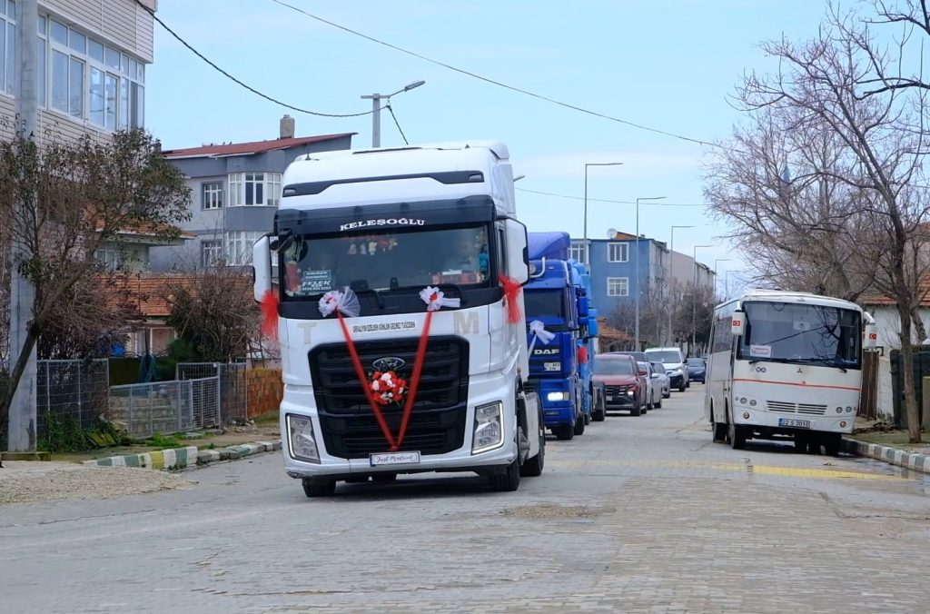 Renkli görüntülere sahne olan TIR’lı gelin konvoyu, Keşan’da vatandaşların da ilgisini çekti.