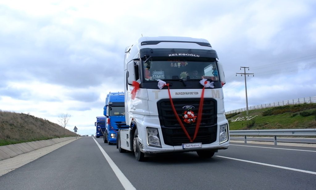 Tuğçe Durak’ı, İpsala ilçesine bağlı Yenikarpuzlu beldesindeki evinden alan damat, kendi kullandığı süslenmiş TIR ile Keşan’daki nikah salonuna doğru yola çıktı. Çiftin konvoyuna, damadın şoför arkadaşları da süsledikleri TIR’larla katıldı. Kentin işlek caddelerinde gelin arabası olarak hazırlanan TIR’la tur atan çift, daha sonra Keşan Belediyesi nikah salonuna geçti.