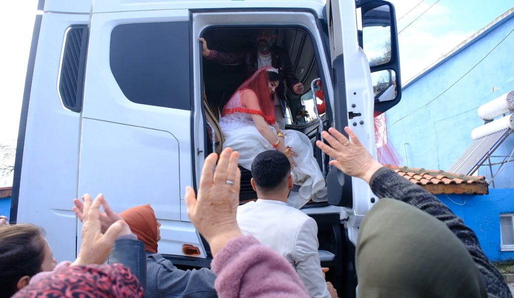 Edirne’nin Keşan ilçesinde TIR şoförlüğü yapan 24 yaşındaki Mehmet Şükrü Durak, 22 yaşındaki Tuğçe Durak ile hayatını birleştirdi. Mesleğini düğününe taşıyan damat, dorsesiz TIR’ını süsleyerek gelin arabasına dönüştürdü ve eşini bu araçla nikah salonuna götürdü.