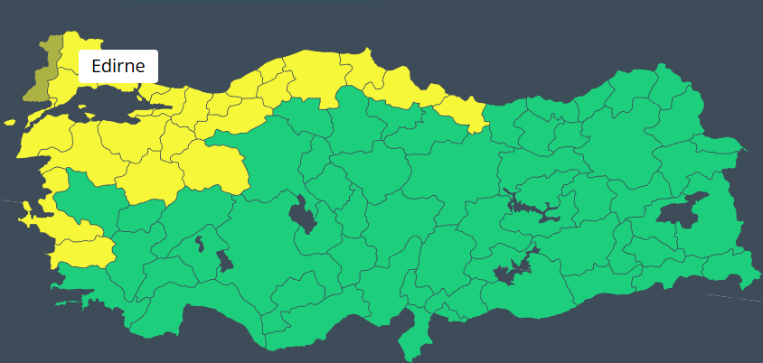 Meteoroloji Genel Müdürlüğü, Marmara, Ege ve Karadeniz bölgelerinde yer alan, aralarında Edirne, Kırklareli ve Tekirdağ'ın da bulunduğu 24 il için sarı kodlu meteorolojik uyarı yayımladı. Yapılan değerlendirmelere göre bazı illerde kuvvetli rüzgâr ve sağanak yağış etkili olacak.