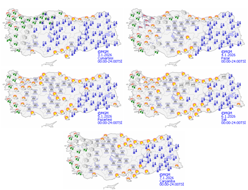 - 5 Ocak Pazartesi günü yağışlı hava devam edecek. Hava sıcaklığı gece saatlerinde 13 derece, gündüz ise 15 derece seviyelerinde seyredecek.