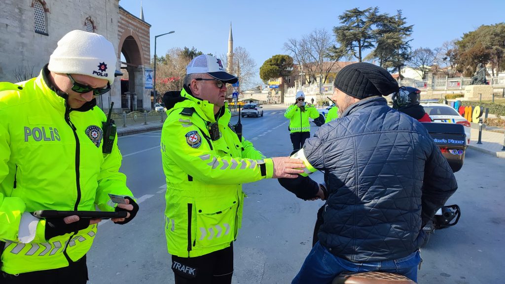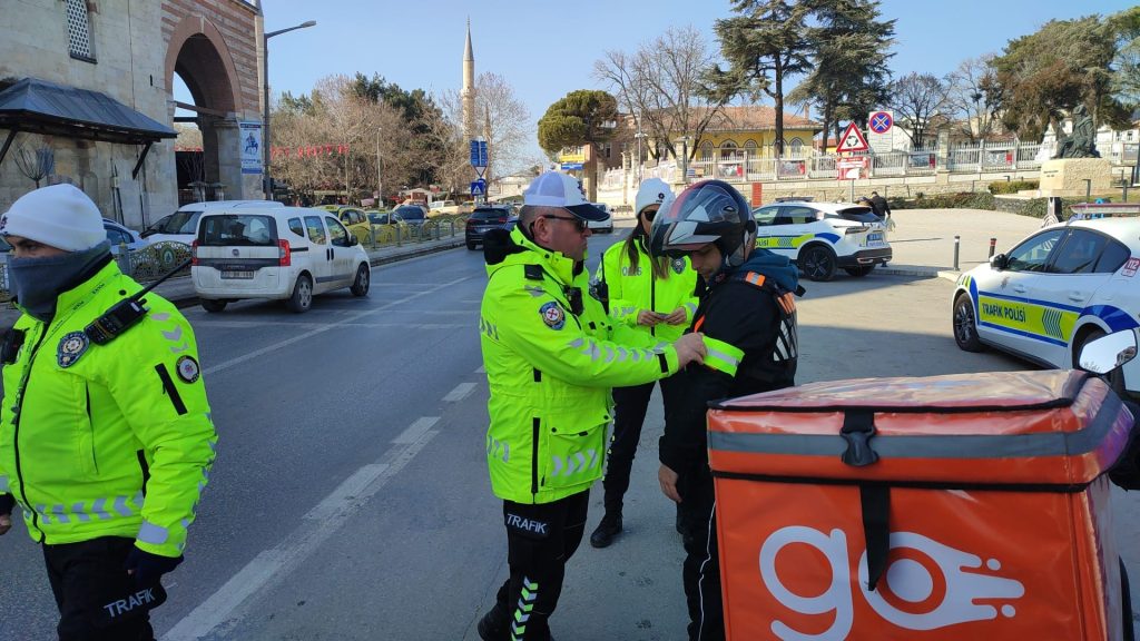 Edirne’de İl Emniyet Müdürlüğü Trafik Tescil Denetleme Şube Müdürlüğü ekipleri, kentin Atatürk Bulvarı Selimi meydanında motosiklet sürücülerine yönelik denetim gerçekleştirdi. Sürücülerin, kask, far, park lambaları, yan aynaları, sürücü belgelerinin kontrol edildiği denetimde, çalıntı ve aranan araçlar da takibe alındı.