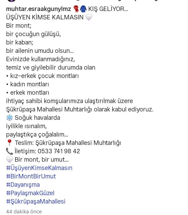 Edirne’nin Şükrüpaşa Mahallesi Muhtarı Esra Akgün Yılmaz, ihtiyaç sahibi vatandaşlar ve çocuklar için mont kampanyası başlattıklarını duyurarak hayırseverleri dayanışmaya davet etti.