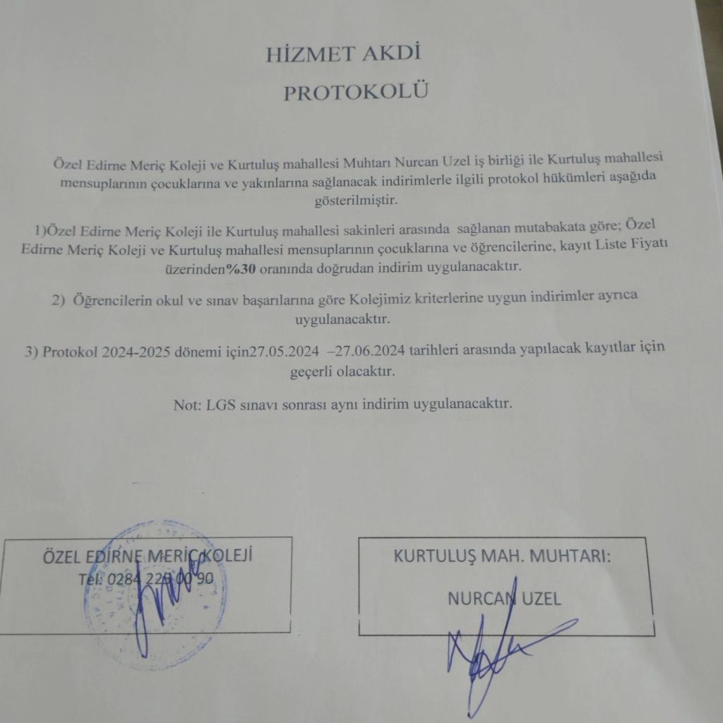Kurtuluş Mahallesi’nde ikamet eden vatandaşların çocukları ve öğrencileri, yine Kurtuluş Mahallesi’nde bulunan Özel Edirne Meriç Koleji’nden yüzde 30 indirimli olarak faydalanabilecek. Kurtuluş Mahallesi Muhtarı Nurcan Uzel, Özel Edirne Meriç Koleji’yle aralarında indirim protokolü imzalandığını duyurdu.