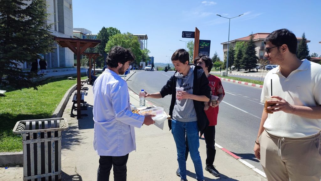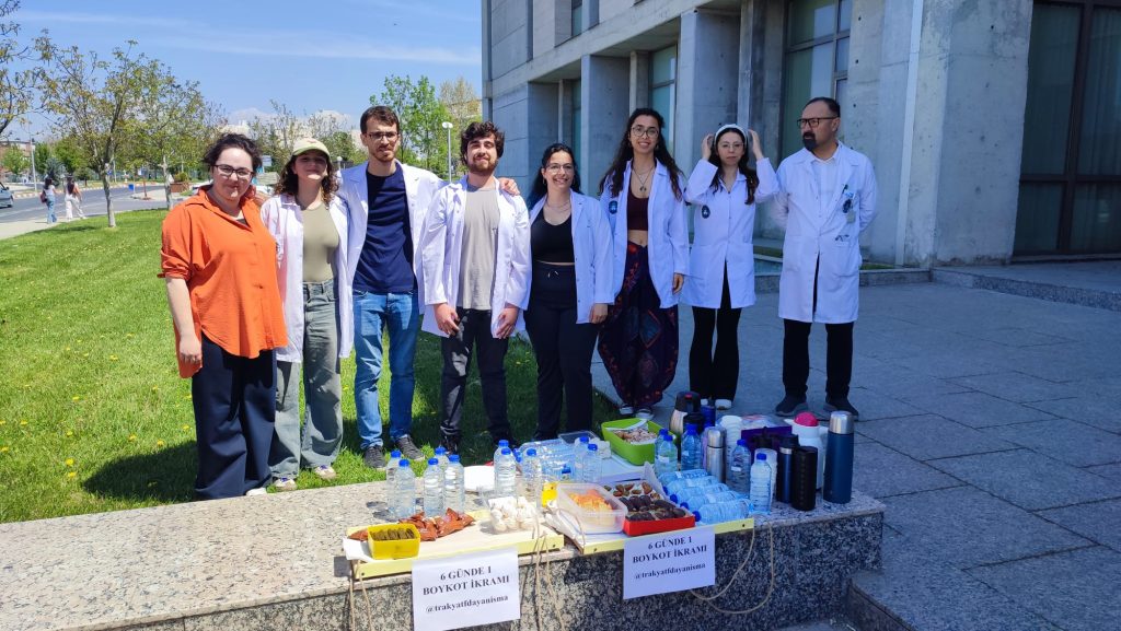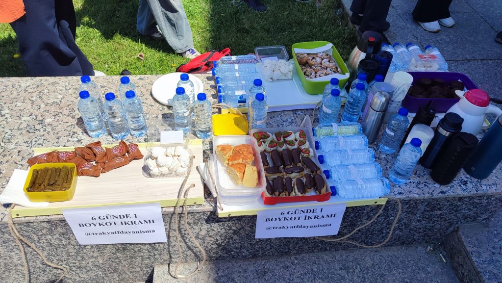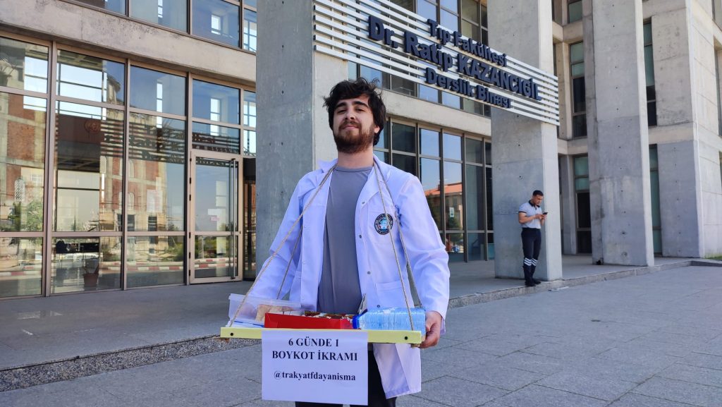 Bugün 4’üncüsü gerçekleştirilen genel boykot kapsamında, Trakya Üniversitesi Tıp Fakültesi Dr. Ratıp Kazancıgil binası önünde bir araya gelen Tıp Fakültesi Öğrenci Dayanışması üyesi öğrenciler, ‘6 Günde 1 Boykot’ başlığı altında kendi aralarında imece usulü hazırladıkları yiyecek ve içecekleri, diğer öğrencilere ikram etti.