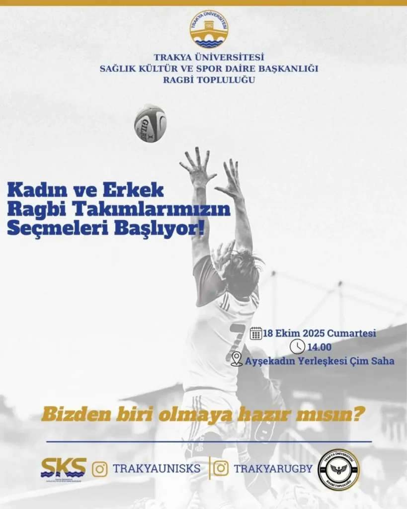 Trakya Üniversitesi Ragbi Topluluğu da alandaki yerini alarak öğrencilerle bir araya geldi. Topluluk üyeleri, öğrencilere ragbi sporunu tanıtarak branş hakkında bilgilendirme yaptı. Ayrıca topluluk, 18 Ekim Cumartesi günü saat 14.00’te Ayşekadın Yerleşkesi Çim Saha’da kadın ve erkek takımları için yeni dönem seçmeleri düzenleyecek. Uzun yıllar ragbi oynayıp antrenörlük de yapan Topluluk Başkanı Zafer Eray, seçmeler öncesi topluluğun faaliyetleri ve ragbiye dair merak edilen konular hakkında bilgi verdi.