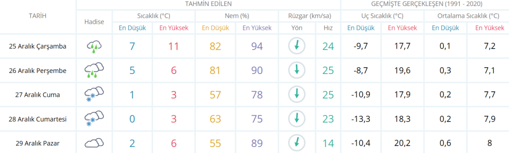 25 Aralık Çarşamba (bugün) sağanak yağışlı, hava sıcaklığı en yüksek 11, en düşük 7 derece.