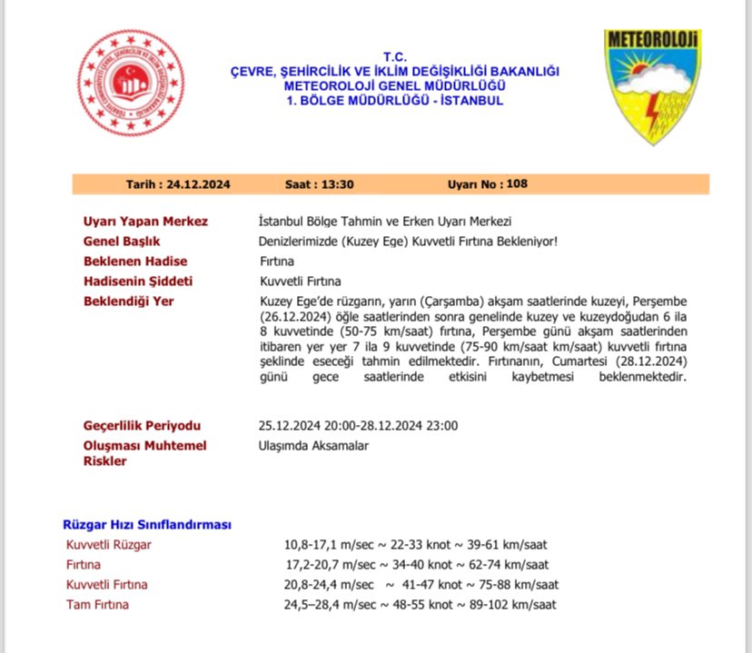 Edirne Valiliği, bölgede bugün akşam saatlerinden itibaren fırtına beklendiğini duyurdu. 28 Aralık Cumartesi saat 23.00'e kadar sürmesi beklenen fırtınada çatı uçması, ağaç veya direklerin devrilmesi, soba ve doğalgaz kaynaklı baca gazı zehirlenmesi, ulaşımda aksamalar gibi olumsuzluklara karşı dikkatli ve tedbirli olunması gerektiği yönünde vatandaşlara uyarıda bulunuldu. Perşembe günü öğleden sonra rüzgarın 50-75 kilometre/saat esmesi beklenirken, Perşembe akşam saatlerinden itibaren ise rüzgarın 75-90 kilometre saat arasında eseceği tahmin edildi.
