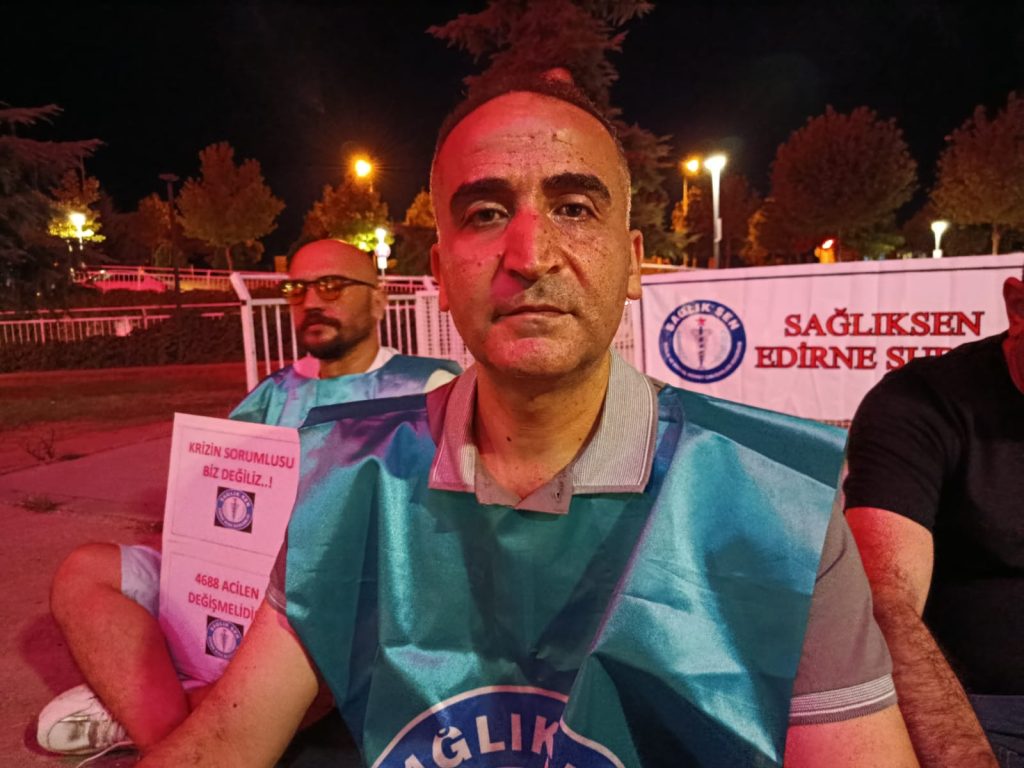 Sağlık-Sen Edirne Şubesi, hükümetin 8. Dönem Toplu Sözleşme görüşmelerinde sunduğu düşük zam teklifine tepki göstermek amacıyla Edirne Sultan 1. Murat Devlet Hastanesi Acil Servisi önünde oturma eylemi düzenledi. Eylemde konuşan Sağlık-Sen Şube Başkanı Erhan Turhan; “Bugün burada, acilin önünde olmamızın sebebi içeride gece gündüz çalışan arkadaşlarımızın sesini duyurmaktır. Kim eşinin, kız kardeşinin sabaha kadar küfür yemesini, omzuna el uzatılmasını ister? Yeter artık. Devletin, biz kamu çalışanlarının sesini duymasını istiyoruz. Verdiğimiz emeğin karşılığını almak istiyoruz. Hakkımızı istiyoruz. Bu çağrımız sadece kendimiz için değil, milyonlarca kamu çalışanı ve emekli içindir” dedi.