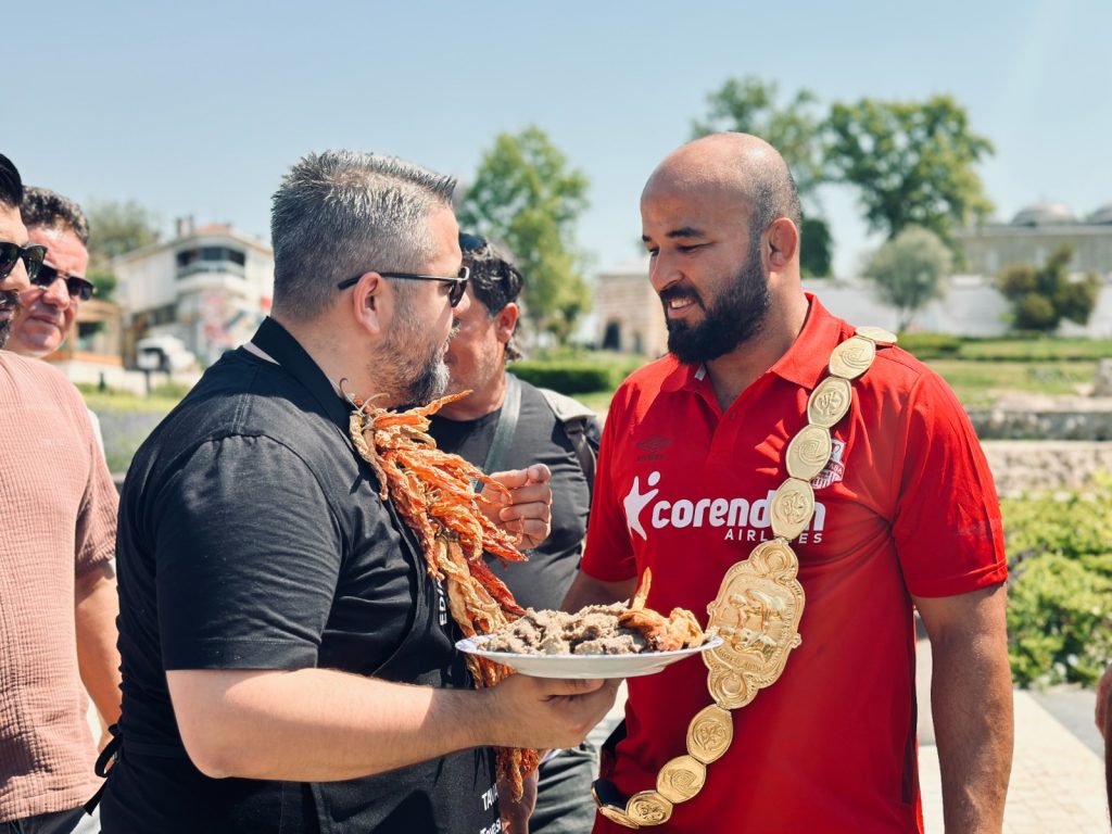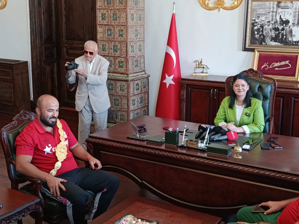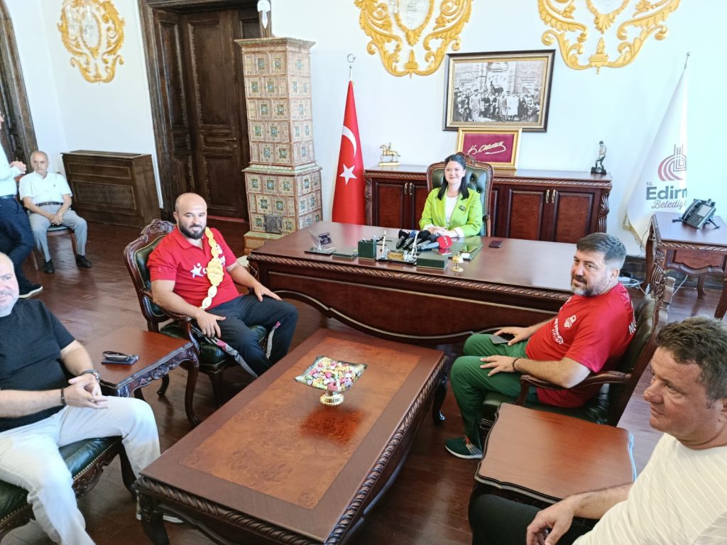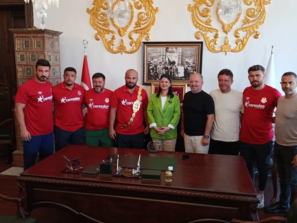 Edirne’nin düğünü bitmeyen güreşin devam eden efsanesi 664’üncü Tarihi Kırkpınar Yağlı Güreşleri’nin dün gerçekleştirilen büyük finalinde, rakibi Feyzullah Aktürk’ü yenerek altın kemere uzanan Orhan Okulu, Edirne Belediye Başkanı Filiz Gencan Akın’ı ziyaret etti. Ziyarette Okulu’nun antrenörleri, takım arkadaşları, başpehlivanlar Furkan Durmuş Altın ve Kürşat Şevki Korkmaz da Okulu’ya eşlik etti.