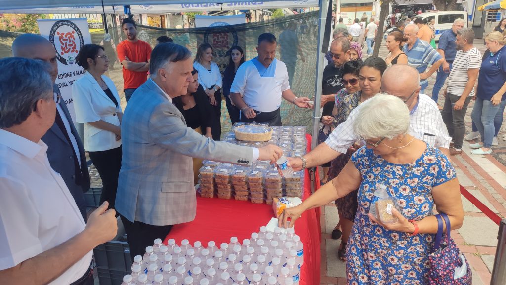 Vakfa bağlı aşevinde pişirilen aşurelerin dağıtım etkinliğine Edirne Vali Yardımcısı Erdoğan Beypınar, Edirne Defterdarı Hüseyin Savan, Edirne İl Milli Eğitim Müdürü Dr. Önder Arpacı ve Edirne Çalışma ve İş Kurumu Müdürü Şengül Çildam katıldı.