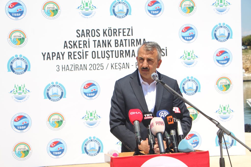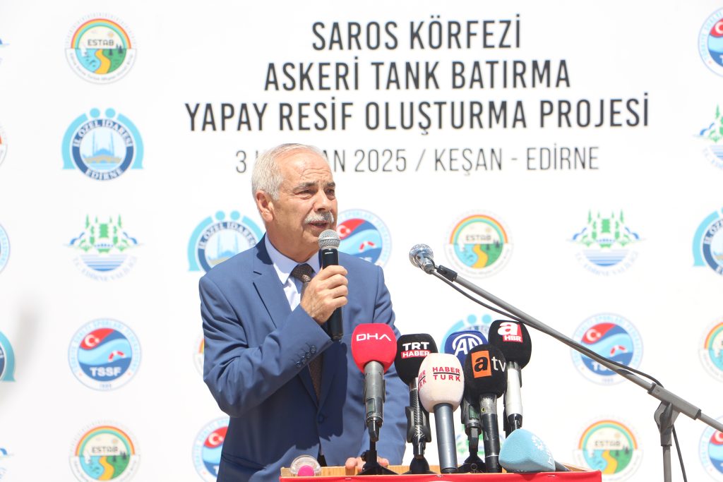 Keşan Belediye Başkanı Mehmet Özcan da, projeye ilişkin geçmişe dayanan çalışmaları hatırlattı. Özcan; "Bizim bölgemizde yaz turizmi klasik deniz, kum, güneş sezonu kısa. Biz dedik ki buna su altı görsellikleri, su altı sporları da katılsın ki bu kısa olan süreyi başka yönlerden telafi edelim diye. Çanakkale Savaşları'na çok yakın bir coğrafyadayız. Öncelikle su altı tarihi müzesi şeklinde bir proje hazırlattık. Bu arada yaptığımız projenin üç hedefi vardı. Bir kaçak balık avcılığının önlenmesi, ikincisi yerel balıkçılara katkıda bulunmak, üçüncüsü de su altı görsellikleri konusunda yardımcı olmamızdı. Öncelikle bu limanın biraz doğu kısmında, tank batığının olacağı yerin biraz uzağında her biri 720 kilogram olan birer metreküp demirli küpler attık. Biri o noktada biri biraz daha açıkta. Emin olun 3 ay sonra o kadar çok canlı gördük ki içlerinde. Hatta o batıklar sırasında burada şamandıralarda sapsarı kalamar yumurtaları görüldü. Hiç tutulmayacak şekilde şuradan oltalarıyla kalamar yakalayanlar oldu. Bundan mutlu olduk. Daha sonra Erikli'deki su sporları yerleşkemizde heykel sanatçılarıyla Seyit Onbaşı'nın heykeli, Türk askerlerinin heykelleri, İngiliz askerlerinin heykelleri derken, buna birden Nusret Mayın Gemisi'ni ekledik, Samsun'dan getirdiğimiz ikiye ayrılmış bir sahil güvenlik botunu bu limanda bazı rötuşlarla Nusret Mayın Gemisi'ne benzetip onun plakasını çaktırdık. Ve 1 Eylül Dünya Barış Günü'nde de çok görkemli bir törenle batığını yaptık. Hala onun hatıraları kafamda canlanıyor. Daha sonra da dönemim için de başlayıp 5 yıl ara vermeden hemen başında, mayıs ayında dünyanın en büyük uçak batığı, batık işlemini gerçekleştirdik. Burada TANAP projesiyle finanse etmiştik. Şimdi de o projenin ilavesi olan, orada bir askeri tank batığını icra edeceğiz. Ben bu konuda bize yardımcı olan, önderlik eden, hiç mütevazı olmayacağım Sayın Valim, çok teşekkür ederim sizlere. Yağcılık falan kabul etmeyin bunu, bize kalsa bunu 2-3 senede zor tamamlardık. Sağ olun, var olun. Makamınızda, olduğunuz yerlerde, burası olsun, belki başka yerler olur, ülkemize hayırlı hizmetler yapmanızı temenni ediyorum."