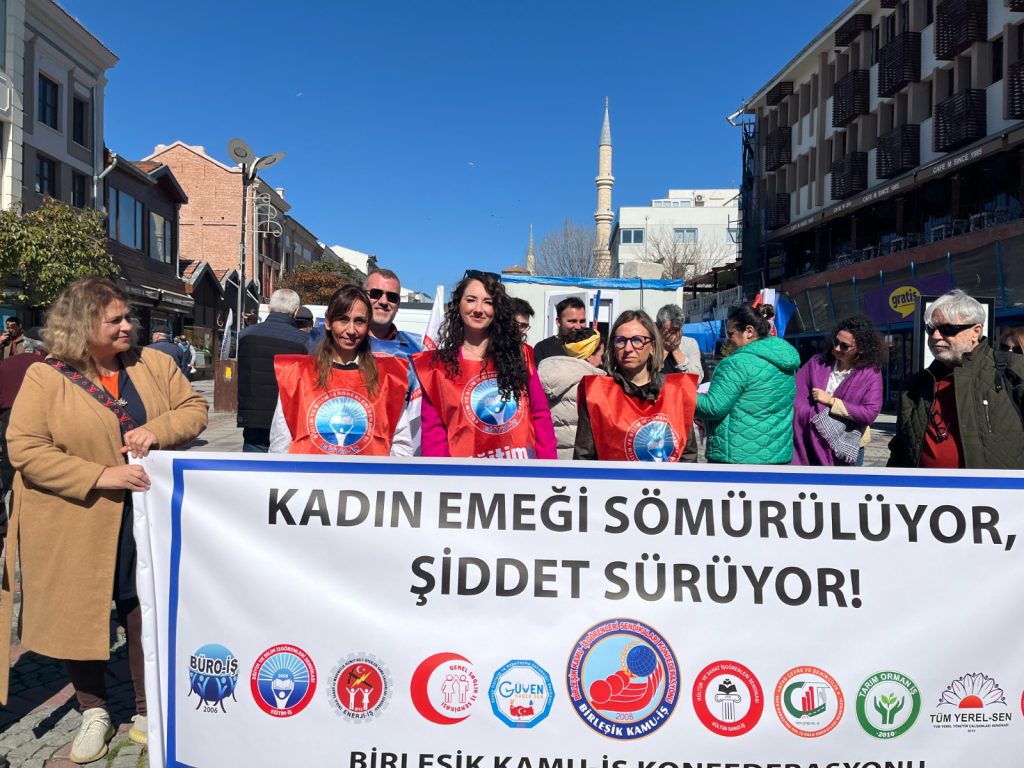 Edirne’de Birleşik Kamu-İş Konfederasyonu'na bağlı sendikaların temsilcileri, 8 Mart Dünya Emekçi Kadınlar Günü dolayısıyla basın açıklaması yaptı. Kentin Saraçlar Caddesi’nde yapılan basın açıklamasında, İstanbul Sözleşmesi'ne yeniden dönülmesi, 6284 sayılı yasanın eksiksiz uygulanması ve Şiddet ve Taciz Sözleşmesi'nin Türkiye tarafından onaylanması talep edildi. Yapılan açıklamada; "İstanbul Sözleşmesi’nden çıkılmasıyla birlikte kadınların yaşam hakkı doğrudan hedef alınmış, kazanılmış haklar birer birer ortadan kaldırılmaya çalışılmıştır. Kadına yönelik şiddeti önlemek için somut ve caydırıcı politikalar hayata geçirilmediği sürece bu vahşetin önüne geçmek mümkün olmayacaktır" denildi.