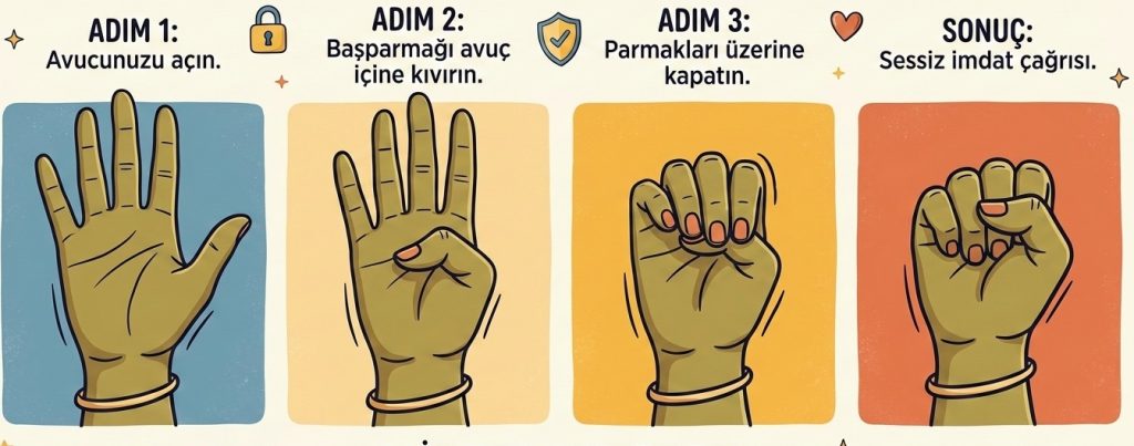 Şiddet gören, saldırgan tarafından rehin tutulan kadınların yaptıkları bu avuç açık, başparmak içerde, parmaklar üstüne kapanır el hareketi sessizce yardım istedikleri anlamına geliyor.