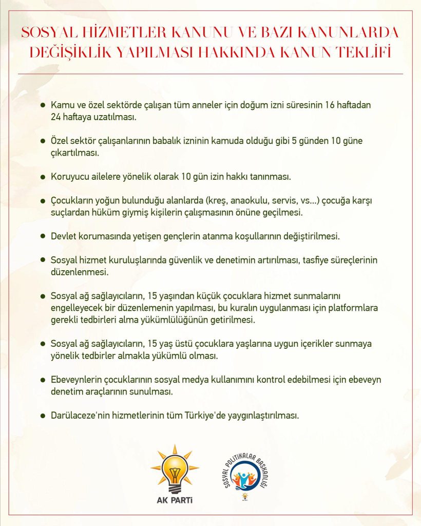 Teklife göre, Doğum izninin 6 aya yükseltileceğini ve babalık izninde 2 haftaya yükseltileceğini açıklayan Aksal, “15 yaş altına sosyal medya kısıtlaması getiriliyor. Aldatıcı reklamların önüne geçiliyor. Belirli suçlardan mahkûm olanların çocukların bulunduğu alanlarda çalışması engelleniyor