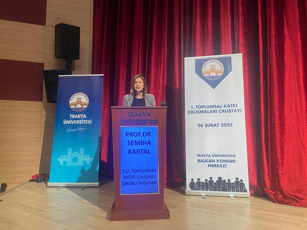 1. Toplumsal Katkı Çalışmaları Çalıştayı Trakya Üniversitesi ev sahipliğinde Balkan Kongre Merkezi’nde gerçekleştirildi. Açılışta saygı duruşu ve İstiklal Marşı okunduktan sonra Mustafa Necati İlkokulu öğrencileri tarafından ritim gösterisi yapıldı. Gösterinin ardından konuşma gerçekleştiren Trakya Üniversitesi Toplumsal Katkı Çalışma Grubu Başkanı Prof. Dr. Semiha Kartal, çalıştayın önemine değindi. Kartal; “Üniversitemiz sadece akademik başarılarıyla değil aynı zamanda topluma katkı sağlamak adına yürüttüğü projelerle de adından söz ettirmektedir. Bugün burada bu katkıları daha görünür hale getirmek, daha etkin ve sürdürebilir çözümler geliştirmek amacıyla toplanmış bulunmaktayız. Toplumsal katkı, toplum yararına yapılabilecek her türlü faaliyet ve hizmeti kapsayan, toplumun gereksinimlerini ve beklentilerini karşılayabilecek etkili ve sürdürülebilir çözümlerin hayata geçirilmesidir. Sadece bir üniversitenin değil tüm toplumun ortak sorumluluğudur. Trakya Üniversitesi olarak bu sorumluluğu yerine getirmek için sadece kendi potansiyelimizi kullanmakla kalmıyor, paydaşlarımıza açık olma ve çevreyle etkileşim halinde olma bilinciyle yerel, ulusal ve uluslararası düzeyde iş birlikleri kurarak bu katkıyı en üst düzeye çıkarmayı hedefliyoruz” diye konuştu.