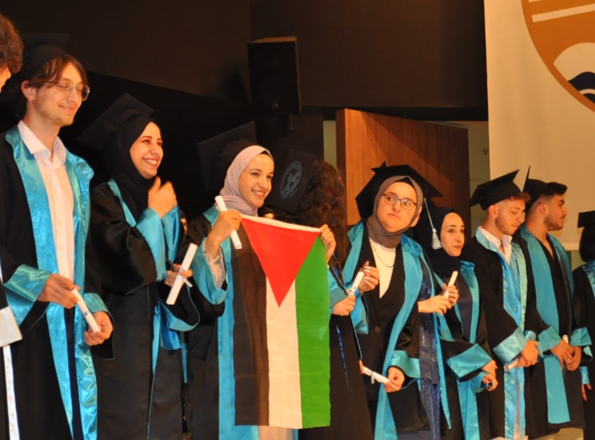 Daha sonra öğrenciler bölümlerine göre sahneye davet edildiler. Bir öğrenci sahneye Filistin Bayrağı açarak çıktı.