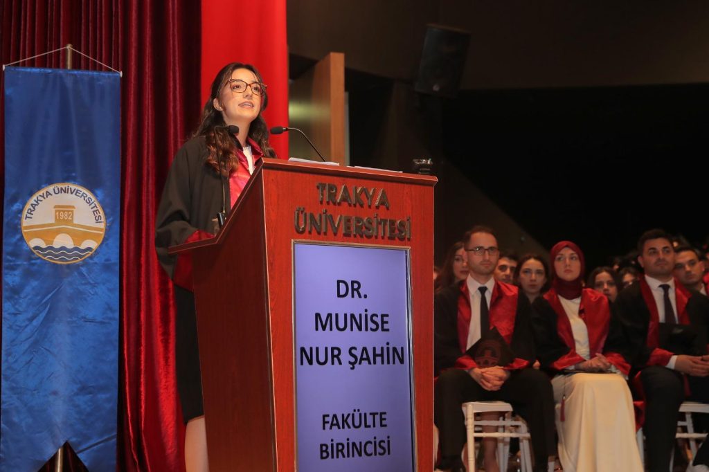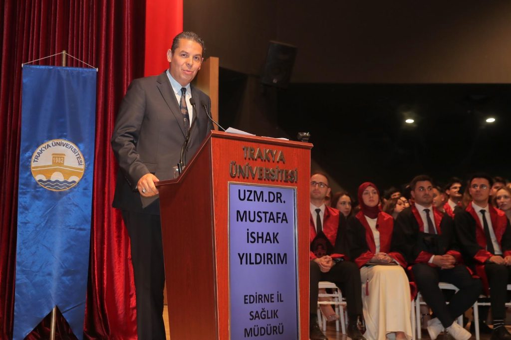 Edirne İl Sağlık Müdürü Uzman Dr. Mustafa İshak Yıldırım ise hekimliğin akıl ve yüreğin uyumuyla yapılması gerektiğini ifade ederek, mezunlara meslek yaşamlarında empati ve iletişimi daima ön planda tutmaları yönünde tavsiyelerde bulundu.