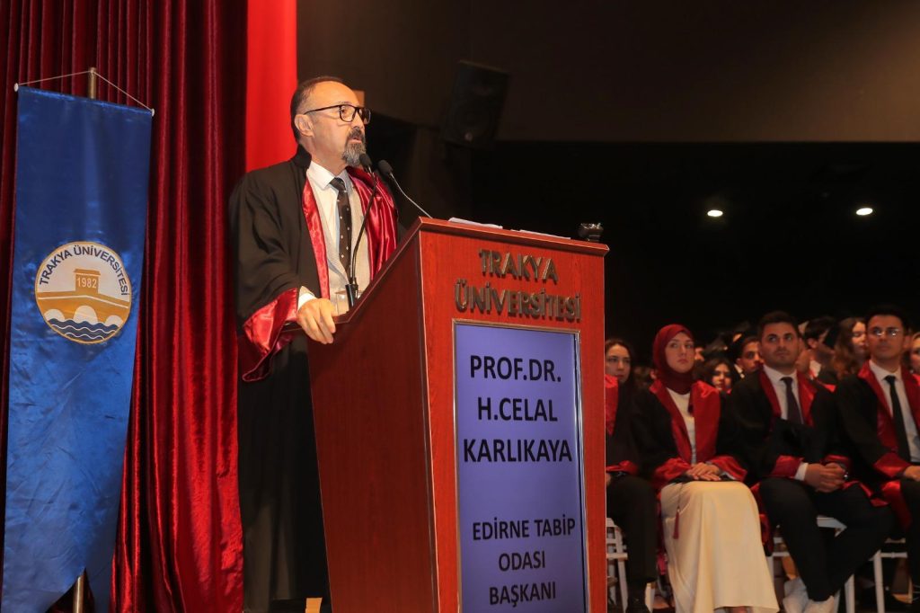 Edirne Tabip Odası Başkanı Prof. Dr. Haydar Celal Karlıkaya, hekimliğin yalnızca bilgi değil, yürekle yapılan kutsal bir meslek olduğunu belirterek, “Bazen çözüm bulamasanız bile çare sizsiniz.” sözleriyle genç hekimlere seslendi.