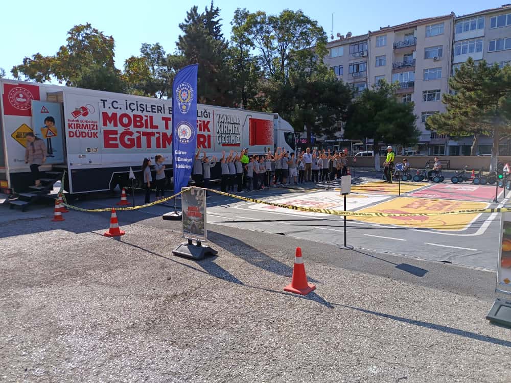 Emniyet Genel Müdürlüğü Trafik Başkanlığı Mobil Trafik Eğitim TIR’ı, Edirne’de ilkokul öğrencilerine uygulamalı trafik kuralları eğitimi vererek hem eğlendirdi hem öğretti.