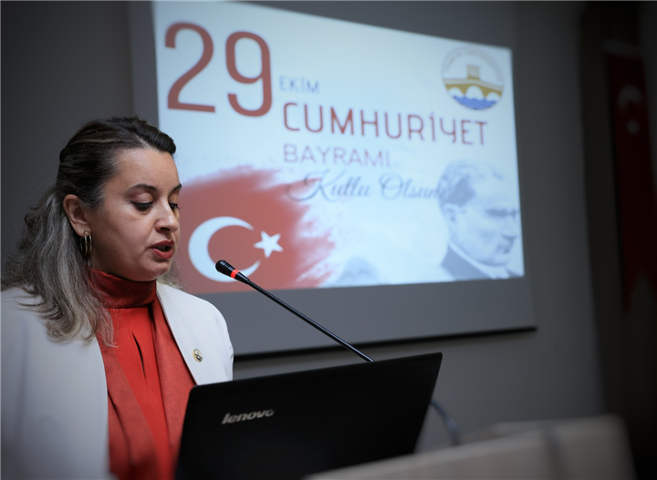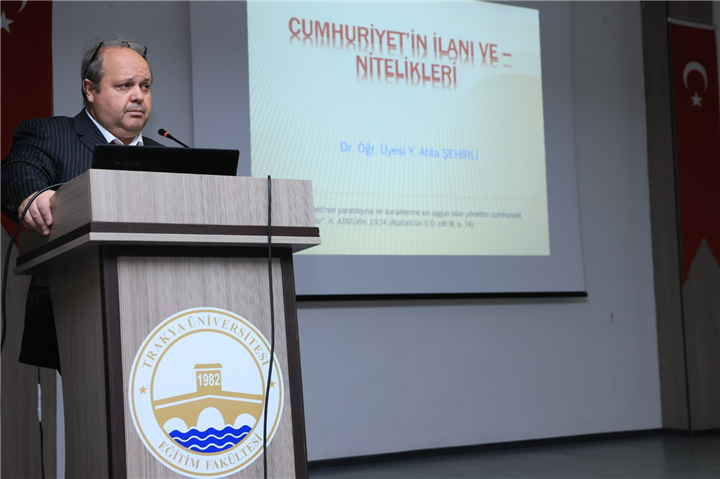 Konuşmalardan sonra Dr. Öğr. Üyesi Yücel Atilla Şehirli, “Cumhuriyet’in İlanı ve Nitelikleri” konulu bir konferans verdi. Şehirli konuşmasında, Cumhuriyete giden yolda nelerin yaşandığı, Mustafa Kemal Atatürk’ün vizyonu, Cumhuriyetin kurulma süreci ve toplumumuzun elde ettiği kazanımlar hakkında bilgiler verdi.