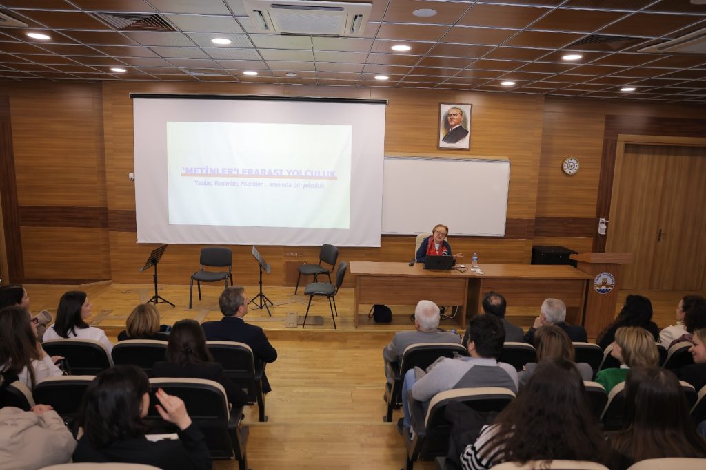 “’Metin’lerarası Yolculuk” başlıklı konuşmasında Ataseven, metinlerarasılık kavramından yola çıkarak edebiyat, resim, sinema ve müzik gibi sanatın çeşitli dallarında anlamın üretilmesine ve aktarılmasına odaklanarak çeviri olgusunun farklı yönlerini ele aldı. Roland Barthes, Umberto Eco, Roman Jacobson gibi dilbilimcilerin metne yaklaşımlarından söz eden Ataseven, edebiyat alanında “yazarın ölümü” olarak bilinen kavramdan bahsetti. Edebiyat metinlerinde anlamı üretenin yazar değil, okur olduğuna değinen Ataseven, yetkin bir okurun metinde bir yolculuğa çıkarak anlam çözümlemelerinde bulunduğunu ve böylece metnin anlamını yeniden ürettiğini belirtti. Ataseven, metinlerarasılığın farklı metinlerin birbirleriyle kurduğu diyaloğa işaret ettiği gibi, diğer sanat dalları için de resimlerarasılık ve müziklerarasılık gibi kavramlardan söz edilebileceğini ifade ederek sanatta anlam üretiminin nasıl bir yolculuktan geçtiğini örnekler vererek anlattı.