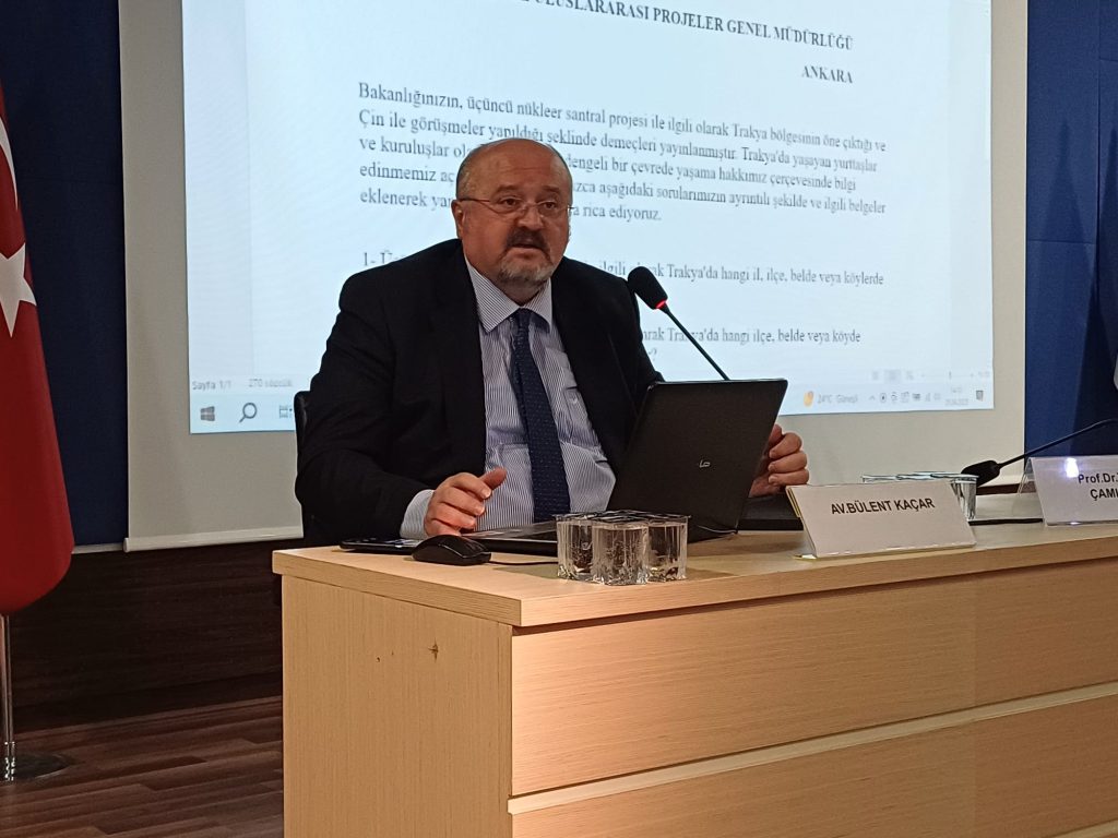 Av. Bülent Kaçar da, Kırklareli DOKU Derneği Yönetim Kurulu Başkanı Göksal Çidem'in Bakanlık yazısına değinerek, santrali Çinli bir şirketin yapacağını ifade etti. Av. Kaçar; “Hiç olmazsa Çin Devleti ve Çinli şirketler ile yapılacağını gösteren bir devlet belgesi bu. Bize kamuoyuna doğru yanıt verilmediğinin de belgesi bu. Çünkü devlet kurumuna o bölgenin elektrik altyapısını yaptırdıysan, çalışmalara başlamış ancak kamuoyundan saklıyorsun demektir. Devlet adına bir takım işler yapılıyor ancak çalışmalar henüz erken bir aşamada diye açıklama yapıyorsun. Hukuken sormamız gereken soru bu. Yer seçim raporu önemli bir konu” şeklinde konuştu.