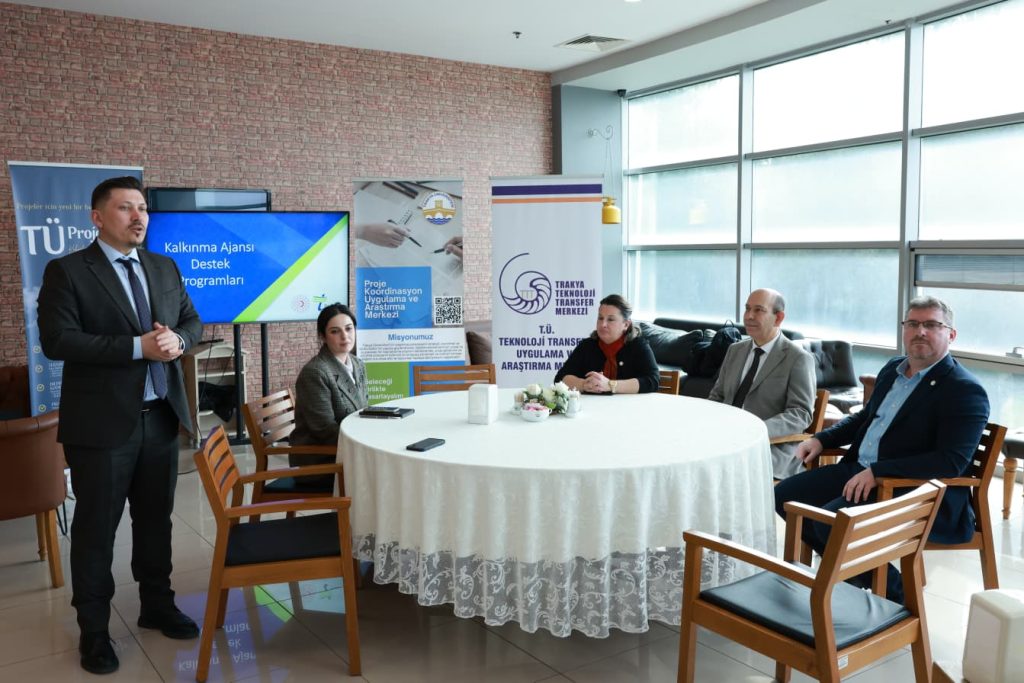 Balkan Yerleşkesi Rektörlük Kafeteryası’nda düzenlenen toplantıya, Trakya Üniversitesi Rektör Yardımcıları Prof. Dr. Ahmet Muzaffer Demir, Trakya Üniversitesi Rektör Yardımcısı Prof. Dr. Eylem Bayır ve Prof. Dr. Mustafa Tan, Proje Koordinasyon Uygulama ve Araştırma Merkezi Müdürü Doç. Dr. Sertaç Arabacıoğlu, Teknoloji Transferi Uygulama ve Araştırma Merkezi Müdürü Dr. Öğr. Üyesi Tarık Yerlikaya, akademisyenler ve araştırmacılar katıldı.