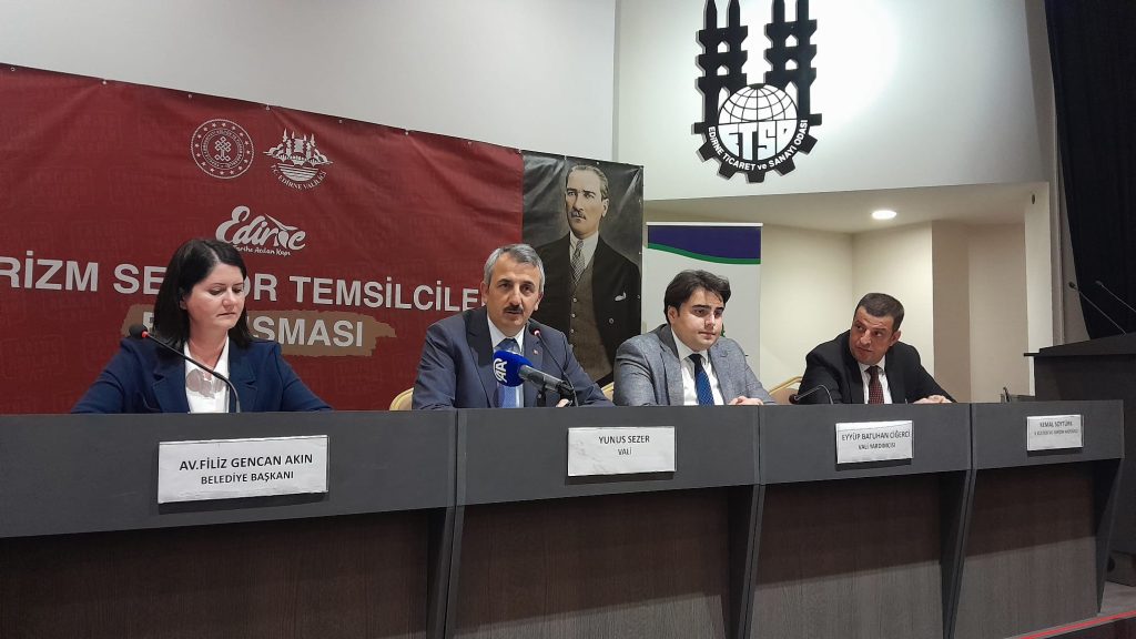 Edirne’deki turizm potansiyeline dikkat çeken Vali Sezer, “İlimizde müthiş bir turizm potansiyeli var. Gelen insan sayısı 5-6 milyon oluyor. 4 tane kapımız var. Ve bu kapılardan her geçen gün insanlar artıyor ve bizim gurbetçilerimiz de eski gurbetçiler değil. Direkt memleketine gitmiyorlar. Gidip bir tatil beldesine, tatilini yapıp ondan sonra işte memleketine gidip geri dönüyor. Bizim buraya atlayıp Antalya'ya gitmeleri ondan sonra başka tatil gitmenin aslında çok bizim açımızdan üzücü bir şey çünkü dünyanın en güzel yerlerinden bir tanesi Saros Körfezi. Dolayısıyla bunu tabii biz kendimize bir eksi olarak yazmalısınız hanemize. Bu konuda da hep beraber fikir yürütmemiz gerekiyor. Bu manada söyleyeceklerim çok fazla. Fakat toparlarsak hem şehir merkezindeki bu potansiyelimizi arttırma, var olanların niteliğini arttırma, en azından artı bir iki somut projeyi gerçekleştirmeyi kendimize hedef koymamız lazım” şeklinde konuştu.