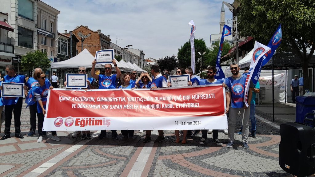 Edirne Saraçlar Caddesi PTT önünde bir araya gelen Eğitim ve Bilim İş görenleri Sendikası (Eğitim-İş) Edirne Şubesi üyeleri bugün sona eren 2023-2024 eğitim öğretim yılının sorunlarını dile getirdiler. Basın açıklamasını yapan Eğitim-İş Edirne Şubesi Başkanı Nedim Zobar;“İktidarın “Türkiye Yüzyılı” etiketini, bulduğu her yere yapıştırdığı bir evrede tamamlanan 2023-2024 Eğitim-Öğretim dönemi, eğitimde birçok değişikliğin yaşanmasıyla son bulmuştur. Ne yazık ki bu değişiklikler, eğitimi ve eğitimin bileşenlerinin koşullarını iyileştiren değil daha da gerileten hamleler olarak tarihe geçmiştir. Eğitim sistemimizi yıllardır sistematik olarak gerici, piyasacı, niteliksiz hale getirmiş iktidar, yakın zamanda “milli”sini yok ettiği milli eğitim sistemimizde bu kez “eğitimi” de parçalamaya başlamıştır. EB’in dernek maskesi takmış tarikatlarla ve Diyanet ile imzaladığı protokoller, eğitimi daha da gerici hale getirirken çocuklarımızı daha da savunmasız bir duruma itmiştir. ÇEDES garabeti, bu dönemde en öne çıkan tehlike olmuştur. Proje kapsamında okullara imam, müezzin, vaiz, din hizmetleri uzmanı ve Kuran kursu öğreticisi gönderilmesi, çocuklara birçok ilde cami temizliği, mezarlık temizliği yaptırılması gibi uygulamalar bu dönemde sıklıkla karşımıza çıkmıştır. “Türkiye Yüzyılı Maarif Modeli” adını taşıyan yeni müfredat, bizlerin ve kamuoyunun itirazlarına rağmen eğitimin belkemiğine yerleştirilmiştir. Laik ve çağdaş eğitim yok edilmiş, iktidarın sorgulamayan nesiller yaratma gayreti bu müfredatta vücut bulmuştur. Okul öncesi eğitimi özellikle zorunlu eğitim kapsamına almayan MEB, bu alanda Diyanet’in daha da faal olmasına yol açmıştır” ifadelerine yer verdi.